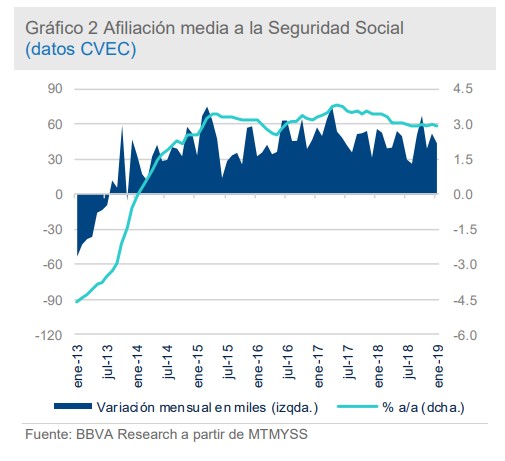 Y dado que el factor estacional pesa mucho, lo relevante es observar cómo evoluciona el empleo descontando el impacto coyuntural de la campaña navideña para tomar el pulso del mercado laboral. Una vez corregido el efecto estacional y el efecto calendario, el número de afiliados habría avanzado en torno a 44.000 personas, 10.000 menos que en el promedio mensual del cuarto trimestre de 2018, según las estimaciones de BBVA Research. Es decir, España habría seguido creando empleo en enero, pero a un ritmo un 20% inferior al de los meses precedentes.