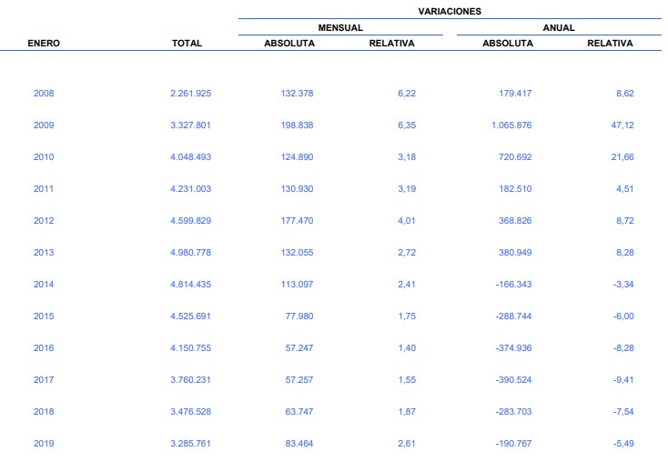 Dentro de la serie histórica, que se inicia en 1997, el paro ha subido en todos los meses de enero. El aumento registrado este año ha superado los repuntes de 2018 (+63.747 parados), 2017 (+57.257 desempleados), 2016 (+57.247 parados) y 2015 (+77.980 desempleados). El peor enero de la serie se registró en 2009, cuando casi 200.000 personas se apuntaron a la listas del antiguo Inem.