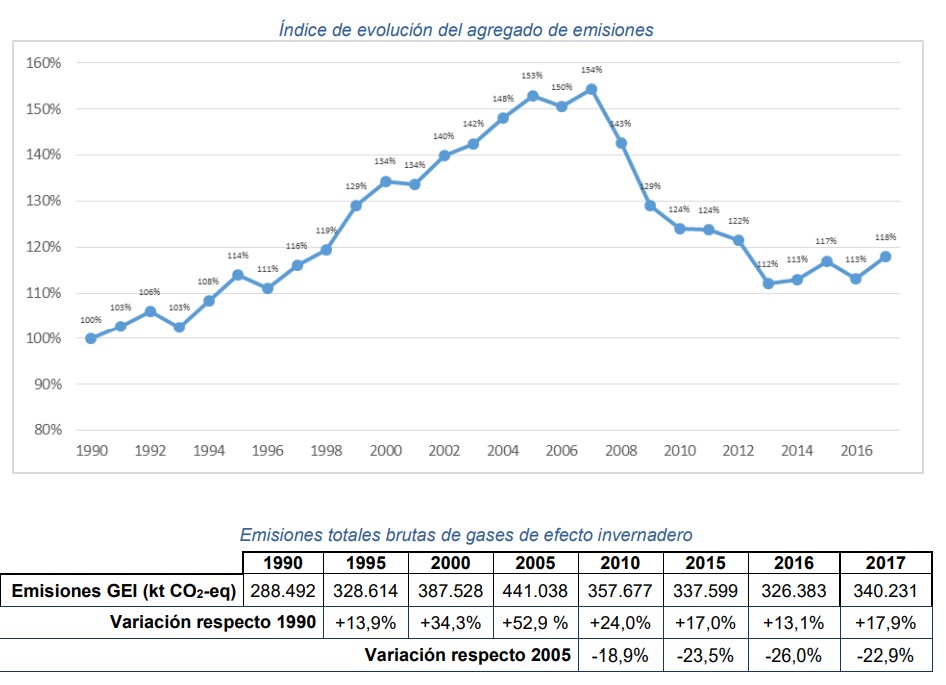 España emitió un total de 340 millones de toneladas equivalentes de CO2 en 2017, un 18% más que los niveles registrados en 1990 y un 23% menos que los de 2005, según los últimos datos oficiales del Ministerio de Transición Ecológica. Pero tal cantidad apenas representa el 0,65% de las emisiones mundiales.
