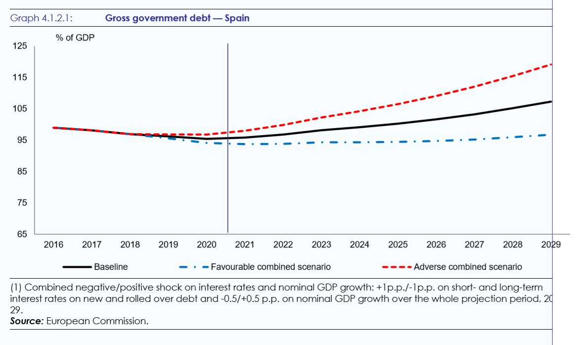 - En el largo plazo, España está condenada a un elevado riesgo de sostenibilidad presupuestaria. (…) Existe un agujero equivalente al 2,3% del PIB [entre 25.000 y 30.000 millones de euros] que debe ser cerrado para equilibrar la deuda en el largo plazo.