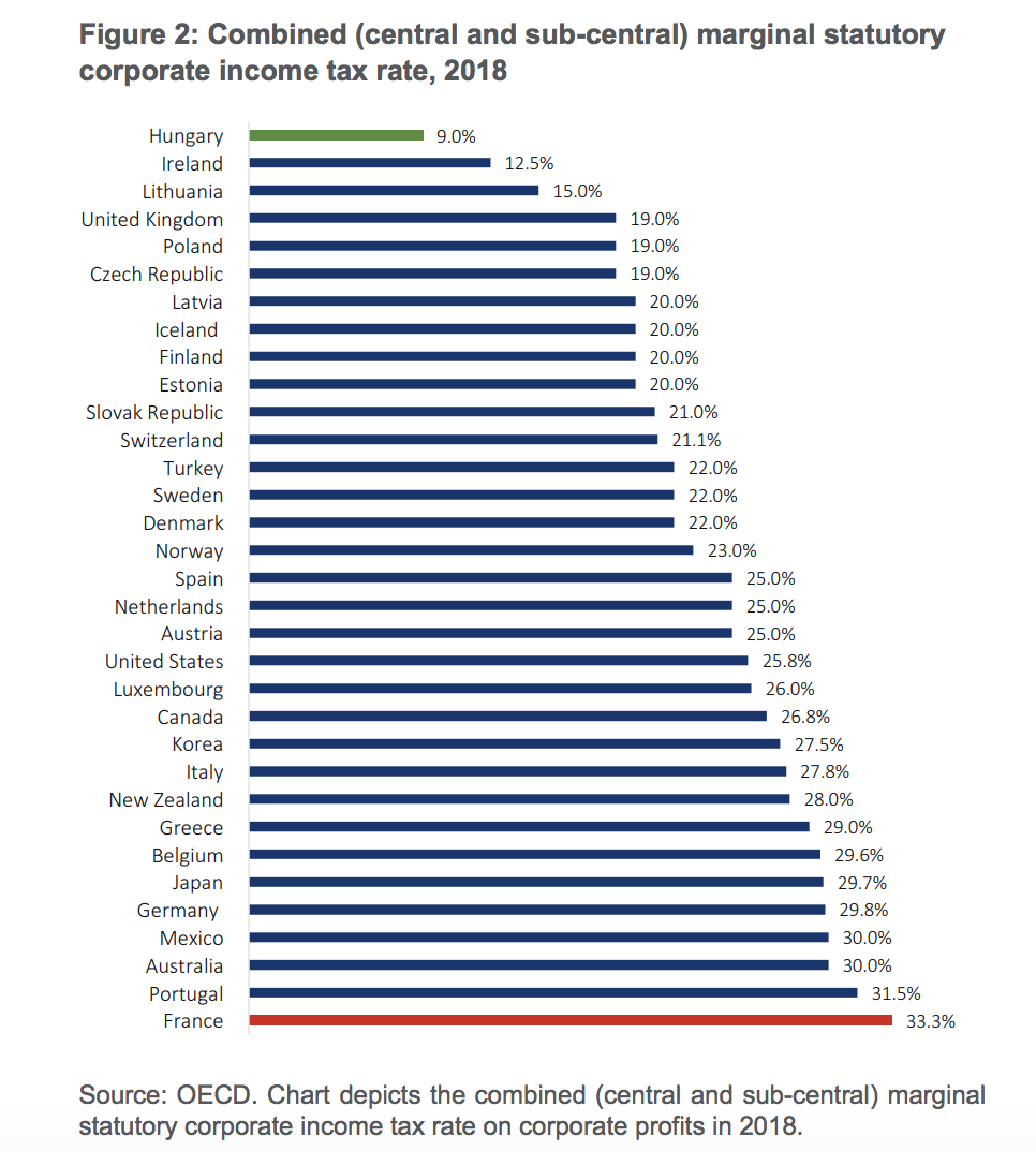 Si tomamos como referencia el tipo general del Impuesto de Sociedades, vemos que España está en la zona media de la OCDE, con un 25%. Por debajo de nuestro país aparece el 9% de Hungría, el 12,5% de Irlanda, el 15% de Lituania, el 19% de Reino Unido, Polonia y República Checa, el 20% de Letonia, Islandia, Finlandia y Estonia, el 21% de Eslovaquia, el 21,1% de Suiza, el 22% de Turquía, Suecia y Dinamarca o el 23% de Noruega.