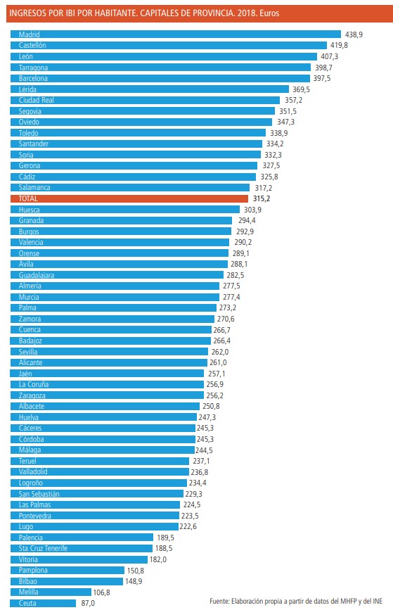 Las diferencias en términos de ingresos por habitante con respecto al IBI son importantes. Así, entre la capital con mayor ingreso y la de menor (Madrid y Ceuta) la brecha es de casi 352 euros. Quince capitales están por encima de la media nacional, mientras que el resto están por debajo.