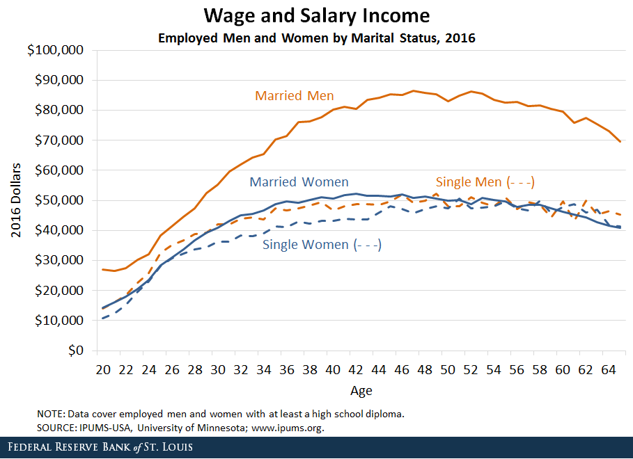 - Hombres casados: hace unos meses, Guillaume Vandenbroucke, investigador del Banco de la Reserva Federal de San Luis, abrió un atractivo debate en EEUU con su artículo titulado "Married Men Sit Atop the Wage Ladder" (algo así como "Los hombres casados se sientan en la cumbre de la escalera salarial").