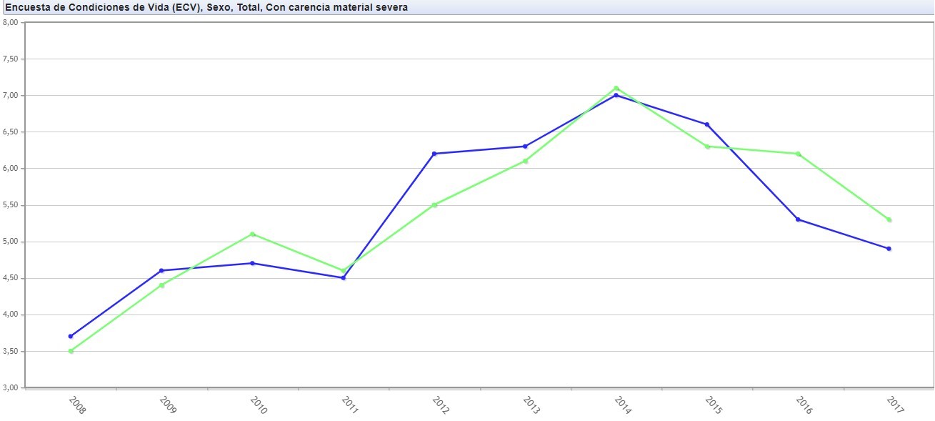 Por un lado, la tasa de carencia material severa, que mide el porcentaje de la población que atraviesa una verdadera situación de necesidad. En la actualidad, este indicador ronda el 5%, tras caer desde 2014 gracias a la recuperación económica y la reducción del paro, pero, a la vista de los datos oficiales del INE, no se observan grandes diferencias entre hombres y mujeres. De hecho, su evolución es similar en ambos sexos, hasta el punto de que la carestía entre los hombres fue superior en los peores años de la crisis.