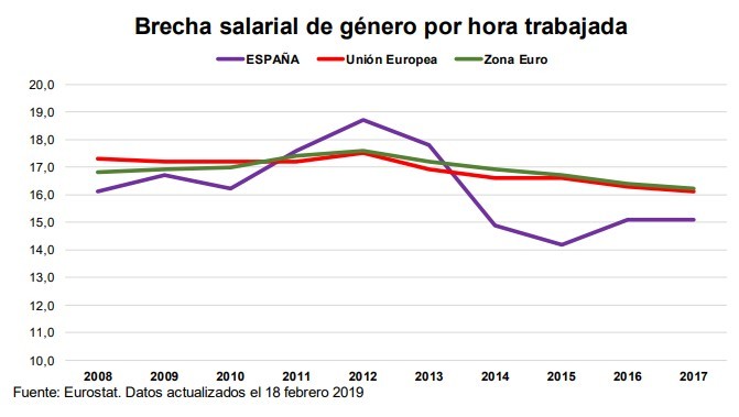 Las mujeres cobran de media un 15,1% menos que los hombres por hora trabajada, según Eurostat. Una de las curiosidades de este dato es que subió bajo el anterior Gobierno del PSOE, desde el estallido de la crisis hasta 2012, para, luego, empezar a descender con la malvada "derecha" del PP en el poder. Asimismo, también resulta destacable el hecho de que la citada brecha española sea inferior a la media de la UE, pero nada de esto escucharán por boca de las feministas.
