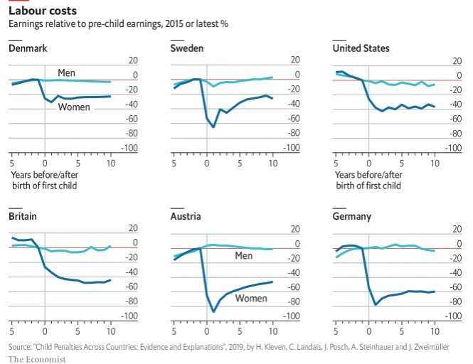 Así pues, lo importante no es la "brecha" en sí, sino las razones que llevan a muchas mujeres a optar por la jornada reducida, su mayor presencia en el cuidado del hogar o la elección de estudios y empleos menos remunerados (la presencia masculina en profesiones técnicas es mayoritaria, por ejemplo). Y es aquí donde hace aparición un factor raramente citado, pero cuya influencia es crucial en la carrera laboral de las mujeres: la maternidad. Su incidencia es tal que las remuneraciones entre hombres y mujeres son prácticamente idénticas antes de tener hijos, pero, a posteriori, las diferencias son más que evidentes.