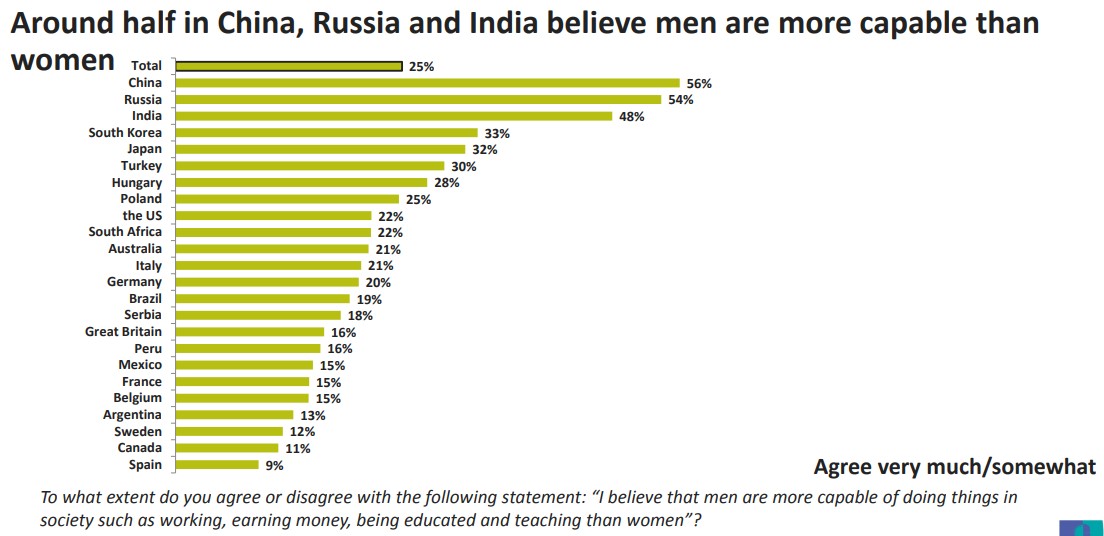 Además, lo más paradójico del asunto es que España es, de lejos, uno de los países menos machistas del mundo, a diferencia de la falsa imagen que ofrecen los grandes medios de comunicación. Una encuesta realizada por Ipsos en 2017 sobre la igualdad de género alrededor del globo arrojó los siguientes resultados: