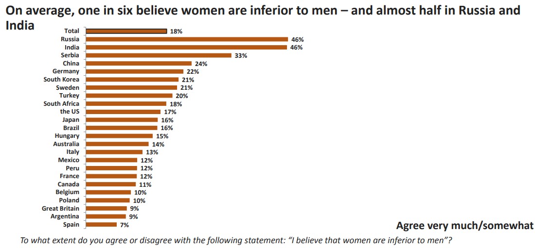 - Y tan sólo el 7% de los encuestados considera que las mujeres son inferiores a los hombres, la menor tasa del estudio.