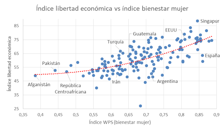 Así, cuanto mayor es el índice de libertad económica, mayor es el índice de bienestar de la mujer, tal y como explicó en Libre Mercado el economista Daniel Fernández. A medida que avanza el capitalismo, también lo hace la situación de la mujer, ya que mejora la inclusión social, desaparecen las leyes discriminatorias y aumenta la seguridad de las mujeres.