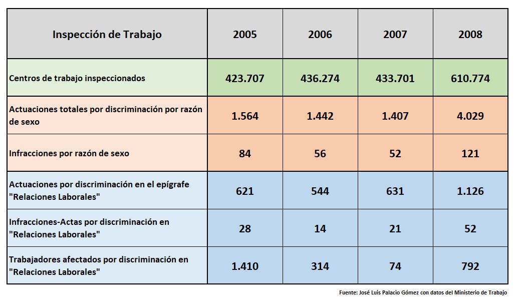 Hay que explicar las cifras de este cuadro. Las dos primeras líneas, que recogen actuaciones por discriminación por razón de sexo, hacen referencia a inspecciones en todos los ámbitos que marca la normativa: relaciones laborales, seguridad y salud laboral, empleo y extranjería, Seguridad Social, Otras áreas.