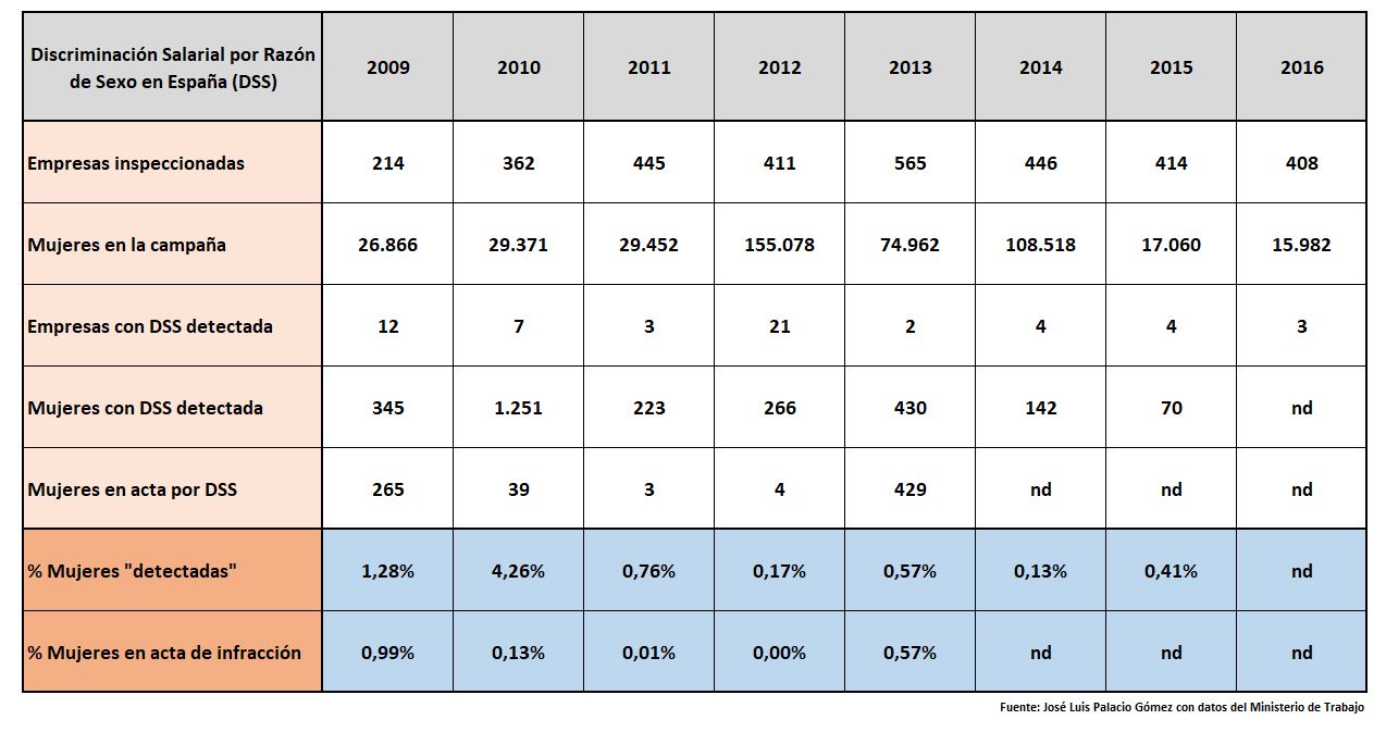 En octubre de 2018, José Luis Palacios Gómez, profesor en el Departamento de Economía de la Empresa de la Universidad Rey Juan Carlos, publicó el estudio "Cuando los números hablan. Análisis y valoración de la estadística oficial de discriminación salarial por razón de sexo en España (2005-2016)" en la revista Sociología del Trabajo, de la Universidad Complutense de Madrid. Es un paper muy interesante, que se aproxima a este tema con un enfoque diferente. No busca un análisis econométrico al uso, con agregados de salarios a los que va incorporando variables explicativas. Lo que hace, al contrario, es ir a los salarios reales, los de verdad, los que pagan las empresas y cobran los trabajadores. Y a los datos que se desprenden de la inspección de trabajo:
