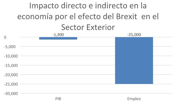 Las exportaciones al Reino Unido representan el 7,2% de las exportaciones españolas, equivalentes a 18.950 millones de euros, mientras que las importaciones suponen 11.443 millones de euros. Ante las barreras arancelarias, es fácil que el saldo neto pudiese empeorar, con un Brexit duro, en unos 3.000 millones de euros, que provocaría un descenso del PIB de 1.300 millones y un desempleo de 25.000 personas.