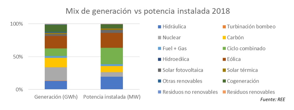 Primero, el mix de potencia instalada arroja ineficiencias cuando lo comparamos con el mix de energía producida. Energías ineficientes desde el punto de vista económico mantienen una capacidad instalada elevada en comparación con la electricidad generada, mientras que, por ejemplo, la energía proveniente de centrales nucleares sufre de la situación contraria. ¿Adivinan qué subyace a esta situación? Correcto. Los miles de millones de subvenciones a las renovables que hemos pagado los españoles durante los últimos años, que han creado enormes parques renovables incapaces de producir energía de forma barata y sin interrupciones temporales.