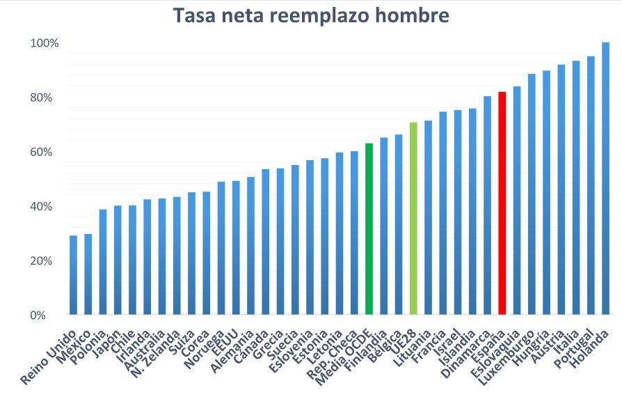 En España, la tasa de reemplazo es muy alta. Los jubilados españoles cobran una pensión equivalente al 82% de su último sueldo (misma cifra para hombres y mujeres). Los jubilados españoles disfrutan de una tasa de reemplazo claramente superior a la de sus homólogos del resto de Europa. En la Unión Europea (28 miembros), la tasa de reemplazo para hombres es de 70,6% y la de mujeres de 70,4%. La tasa de reemplazo en los países de la OCDE (34 países que se consideran desarrollados) es todavía menor, siendo 62,9% para hombres y 62,2% para mujeres.