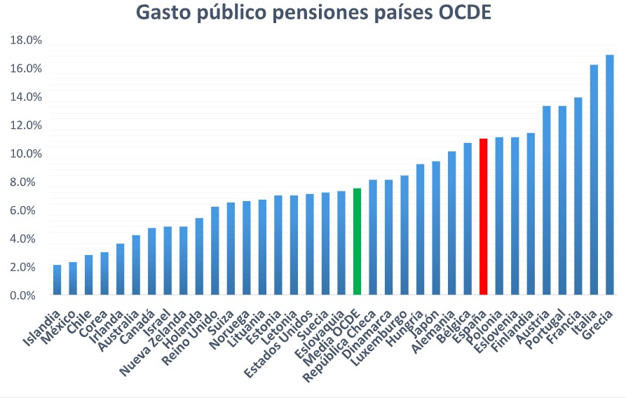 Si analizamos el gasto público sobre PIB, España sale también entre los países que más gasta de los países de la OCDE. Hasta países con población más envejecida como Japón gastan menos que España. En concreto, España gasta el 11% de su PIB en pensiones, cifra muy superior a la de la media de los países desarrollados, que gastan un 7,5% del PIB en pensiones.