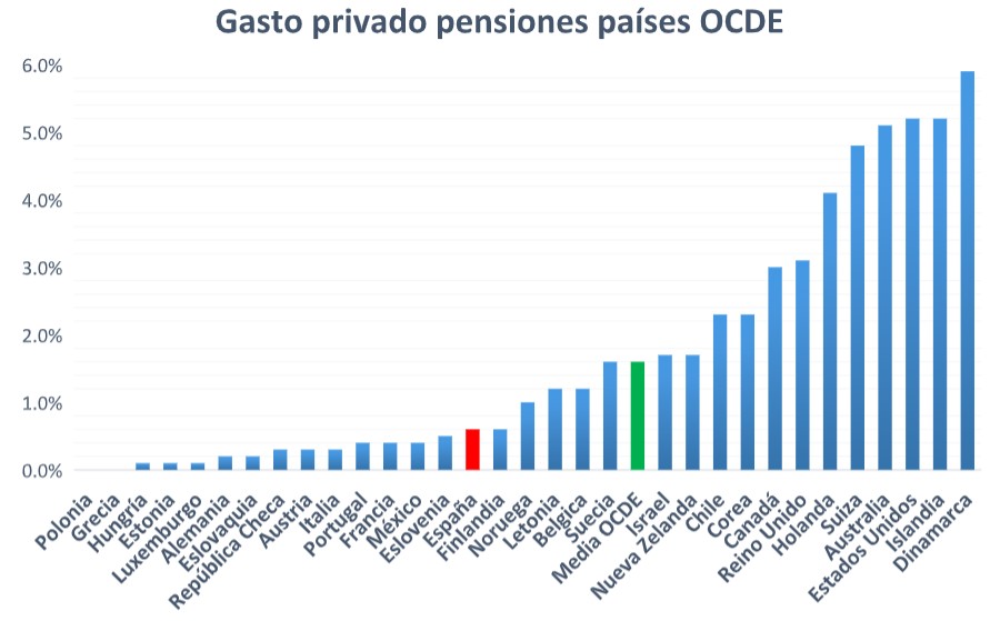 Por el contrario, si vemos el gasto privado en pensiones, España queda claramente por debajo de la media de los países de la OCDE. España gasta en pensiones privadas sólo el 0,6% de su PIB, los países desarrollados un 1,6%. Parece que el sistema público español es tan generoso que los españoles no sienten la necesidad de ahorrar para su jubilación.