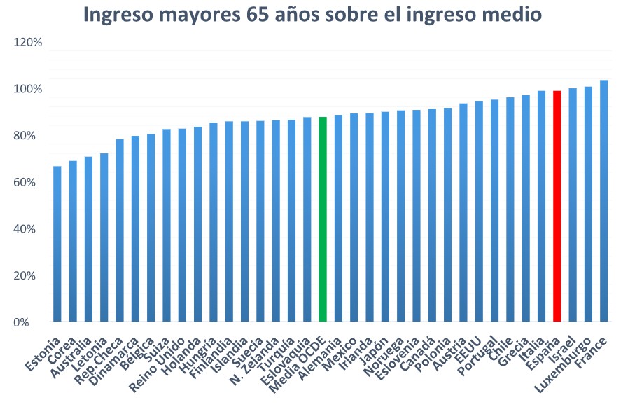 Una vez más vemos cómo los jubilados españoles disfrutan de un ingreso sensiblemente superior en términos relativos que el resto de países desarrollados. El ingreso disponible de los jubilados españoles supone el 98,8% del ingreso disponible de los trabajadores (prácticamente tienen el mismo ingreso). En los países desarrollados esta cifra es del 87,6%.