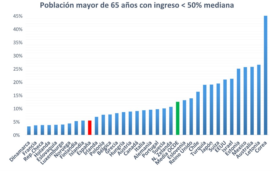Por último, vamos a analizar una de las medidas de pobreza más extendidas, el porcentaje de población con un ingreso por debajo del 50% de la mediana del ingreso mediano. El porcentaje de jubilados españoles que se posee una renta inferior al 50% de la mediana es sólo del 5,4%. Por tanto, sólo un 5,4% de los jubilados españoles podrían ser considerados pobres, porcentaje muy inferior a la media de los países de la OCDE (12,5%).
