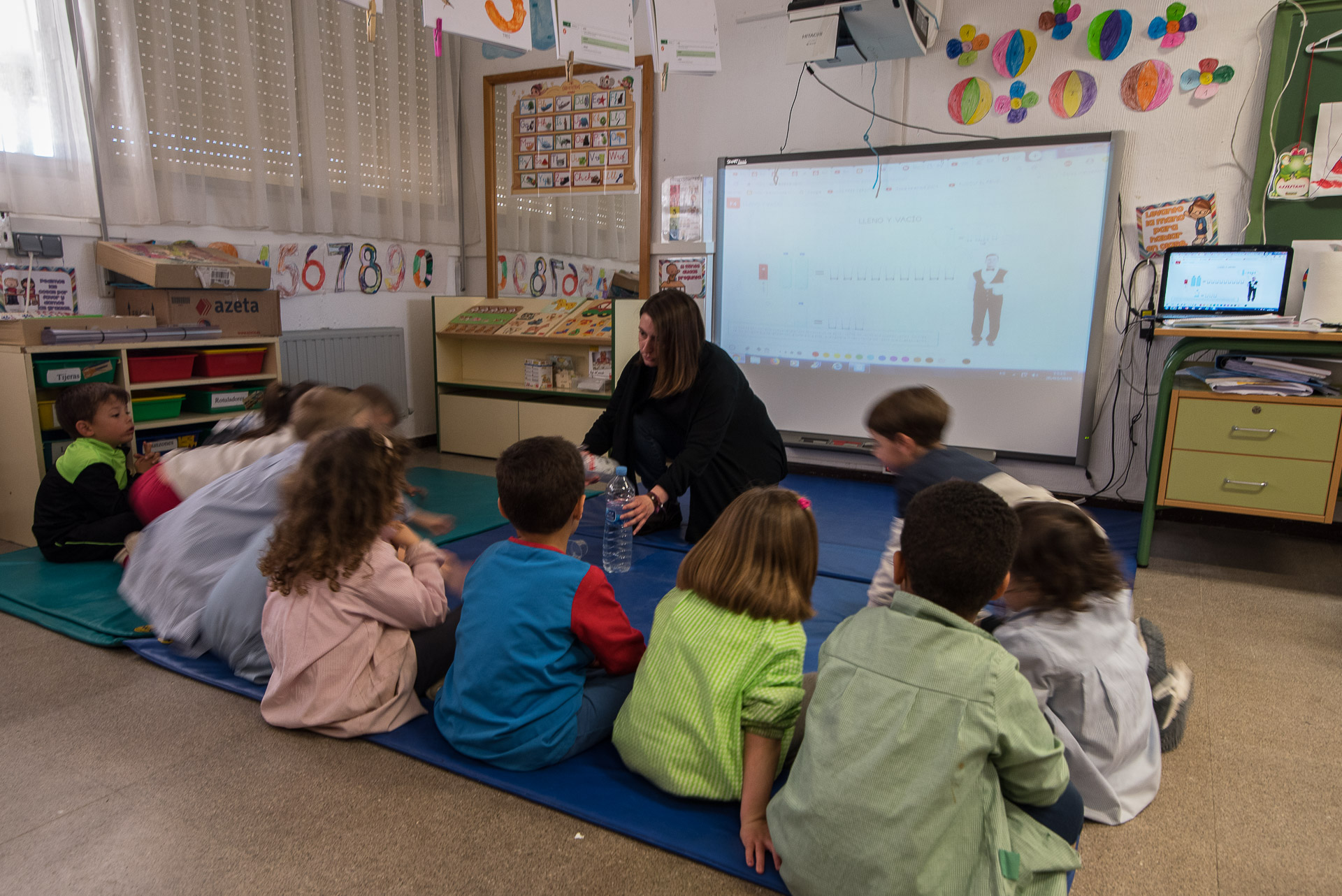 Los niños de una clase atendiendo a la explicación de su profesora y de la pizarra digital.