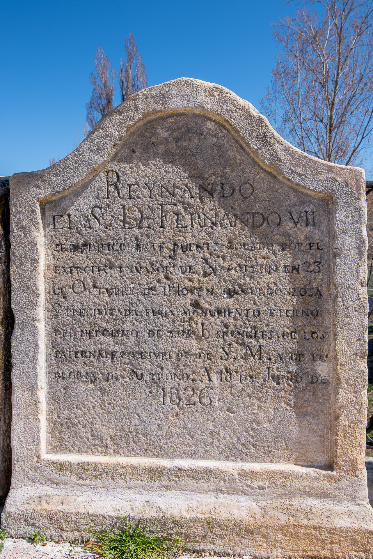 Una vieja placa recuerda la destrucción y reconstrucción del puente sobre el Tajo.
