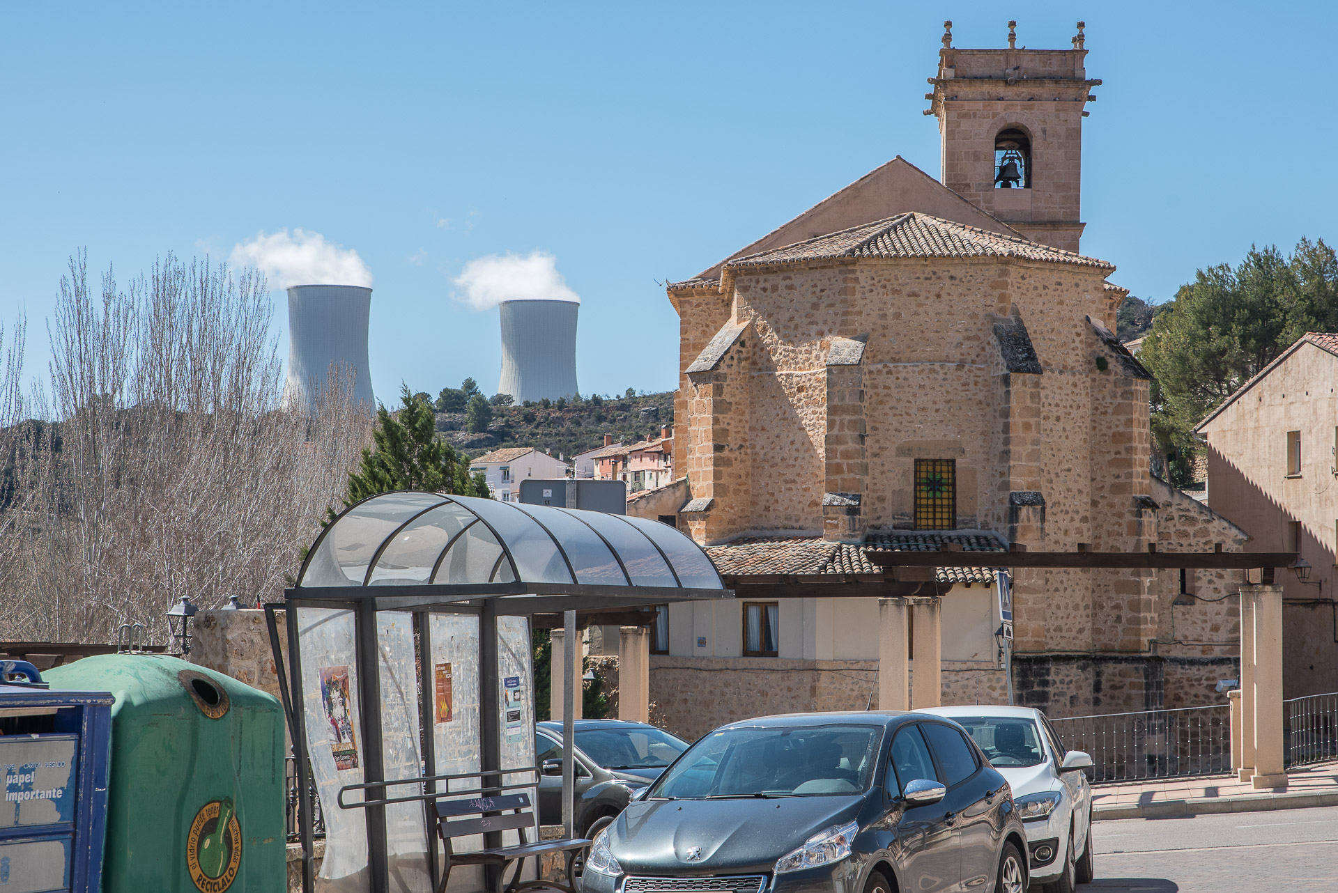 La iglesia de Trillo y las torres de refrigeración al fondo.