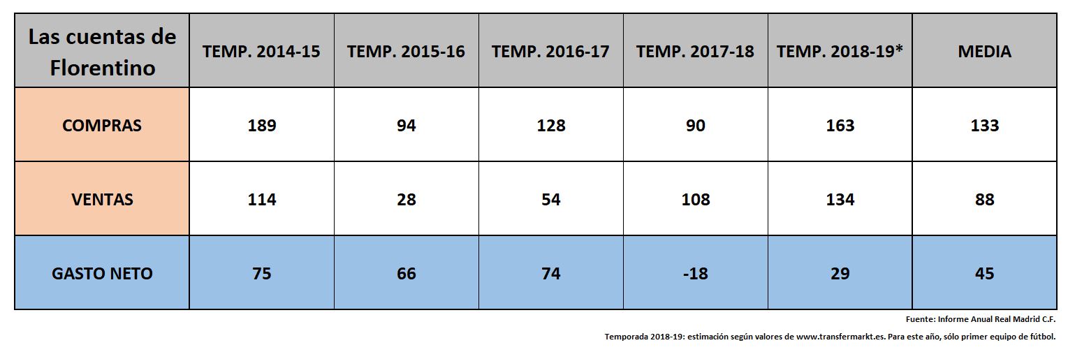 Como vemos, el Real Madrid de Florentino tiene un balance de unos 45 millones de gasto neto cada verano. Eso es, más o menos, lo que le cuesta renovar la plantilla. En nuestro análisis del balance que publicamos hace unos días lo equiparábamos al Capex de una empresa: es lo que necesita invertir en capital fijo para mantener su actividad y ser competitivo.