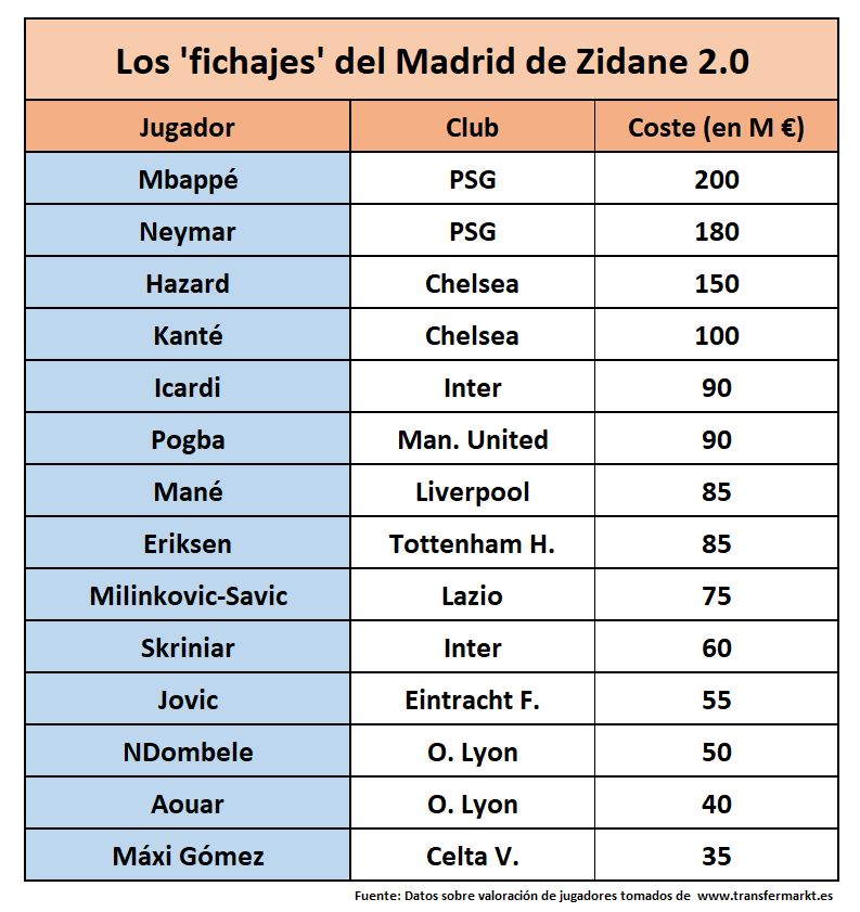 Necesitamos una segunda tabla. La del coste de los posibles fichajes. Y eso es todavía más difícil. Aquí sí que entramos casi en el terreno de la ficción. Hemos usado los nombres que nuestros compañeros de Deportes incluyeron en su galería de esta semana sobre jugadores que interesan a la directiva merengue. Estos son y esto cuestan: