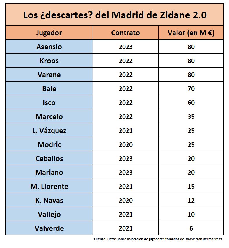 - Las cuentas de Zidane: tras todo este análisis, la pregunta es ¿cuánto dinero tendrá Zidane para fichar? La prensa deportiva asegura que la directiva ha prometido al entrenador francés que tendrá voz y voto en la renovación de la plantilla, pero que también tendrá que asumir las necesidades financieras del club.