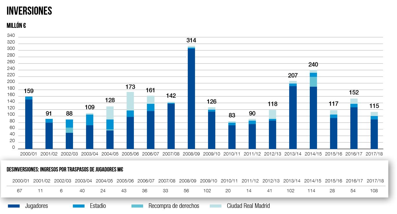- La historia: en el siguiente gráfico, sacado directamente de la memoria económica del Real Madrid, aparece el resumen de inversiones del club blanco en los últimos años. No hablamos sólo de fichajes, sino también del resto de gastos (estadio, Ciudad Real Madrid…).