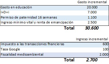 Estamos hablando de un aumento de gasto de 30.000 millones de euros en el mejor de los casos (sin contar la balanza de la Seguridad Social, en la que se encajaría la indexación a las pensiones) frente a un modelo de ingresos para el que solamente citan nuevas tributaciones: La tasa Google (rechazada en Europa), el impuesto a las transacciones financieras, e impuestos medioambientales.