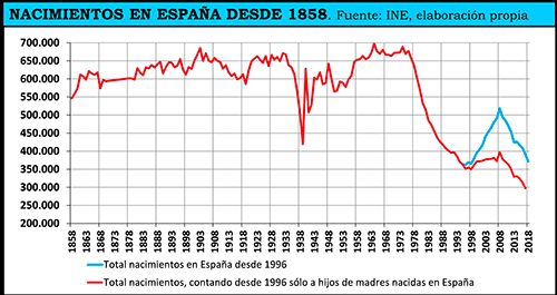 Los datos aportados por Renacimiento Demográfico muestran que, en 1976, cuando España tenía 36 millones de habitantes y sin apenas extranjeros residentes, nacieron aquí 677.000 niños. En 2017, en una España con 46,5 millones de habitantes, incluyendo 6 millones largos de inmigrantes, nacieron 391.000 niños, de los que menos de 300.000 eran hijos de mujeres nacidas en España. En 2018, por los datos preliminares conocidos, hubo una importante caída adicional en el número de bebés.