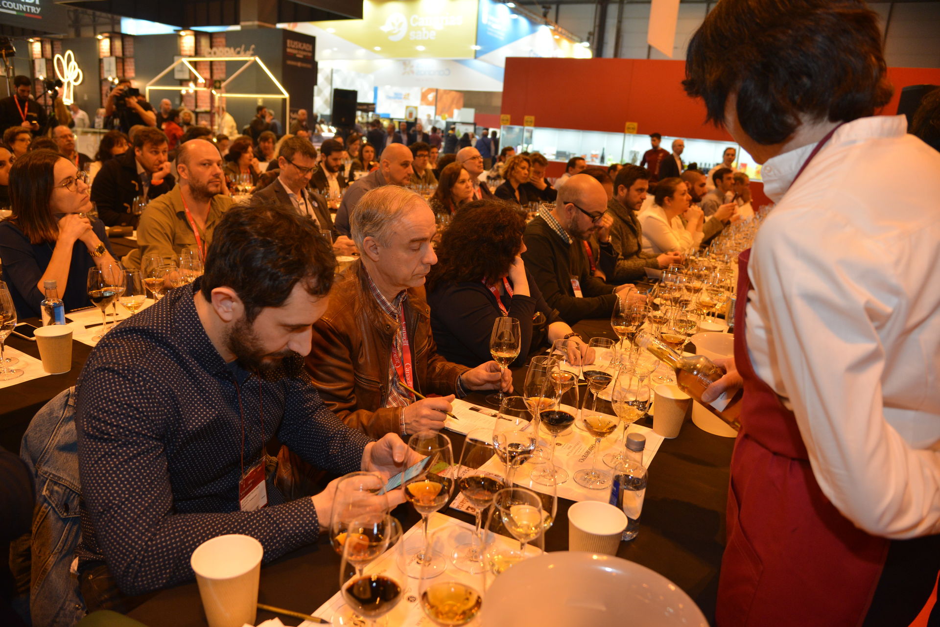 No cabe ni un alfiler. La 33 edición del Salón Gourmet en Ifema se encuentra abarrotada de visitantes entusiasmados por probar los manjares que por allí desfilan. Más de 40.000 alimentos y bebidas se han concentrado en la feria de los sabores más exquisita del año. Cientos de platos y vinos danzaban por los pasillos entre bandejas de plata y camareros acalorados que no daban abasto para tanto sibarita con hambre.