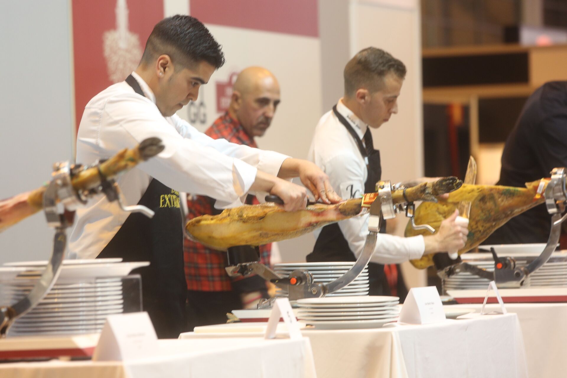 Para tamaños XXL, los del jamón. El concurso de cortadores ha empezado, y es que, según anuncia uno de los profesionales al grupo que se concentra a su alrededor, "el modo en el que esté cortado el jamón ibérico influye en el sabor. Muchos no sabéis cortarlo y he visto cómo en lugar de lonchas, destrozan patas de Cinco Jotas haciendo filetes de un centímetro. ¡Eso debería tener multa!", ríe el experto mientras enseña un cuchillo afilado que parece cortar hasta el aire que allí se respira.