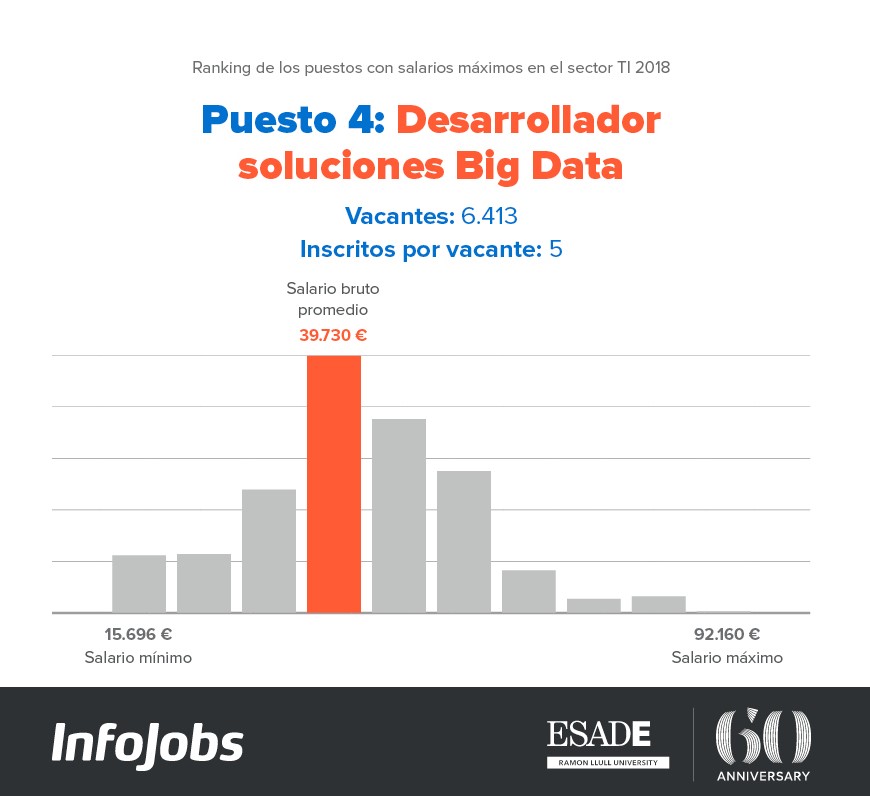 También superan los 90.000 euros brutos anuales máximos los Desarrolladores de soluciones de Big Data (cuyo salario anual bruto medio es de 39.730) o los Consultores informáticos (con un salario medio que llega a los 36.000 euros y 12.000 vacantes publicadas en 2018).