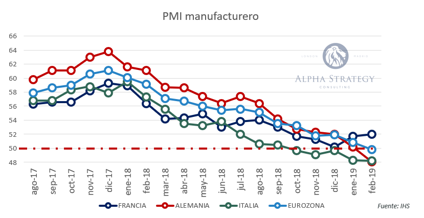 Por el momento, los indicadores adelantados profundizan en la desaceleración. La producción industrial decreció hasta el 5,3% en enero, 4 décimas menos que en diciembre. El índice PMI manufacturero de febrero fue de 49,2 puntos, la menor cifra desde febrero de 2016.