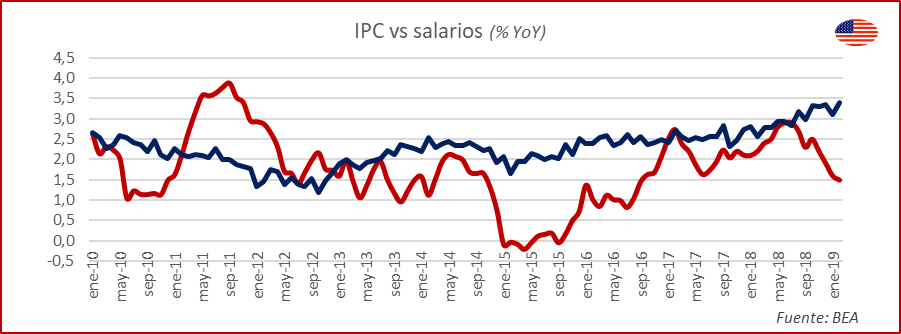 El último dato adelantado mensual de PIB, ofrecido por Morgan Stanley, refleja un crecimiento mensual del 0,27% en febrero, una cifra superior a la de febrero de 2018 e incluso por encima de la del pasado enero. Este crecimiento está permitiendo no sólo crear empleo, sino impulsar el crecimiento de los salarios, que registran subidas capaces de duplicar el IPC.