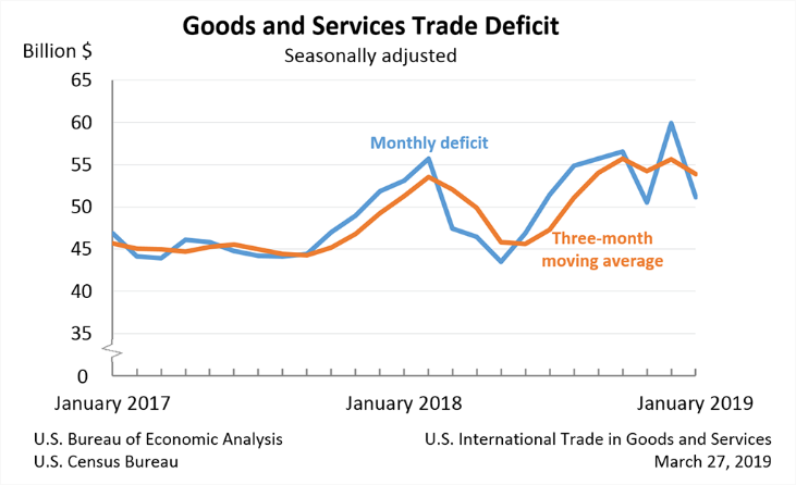 El déficit comercial de bienes y servicios de Estados Unidos correspondiente al mes de enero de 2019 fue de 51.100 millones de dólares, un 14,6% menos que el de enero de 2018. China se lleva la peor parte, con un déficit que descendió en 5.500 millones de dólares, debido, mayoritariamente, a un descenso de las importaciones de 5.700 millones de dólares, un 12% menos con respecto al dato de diciembre.