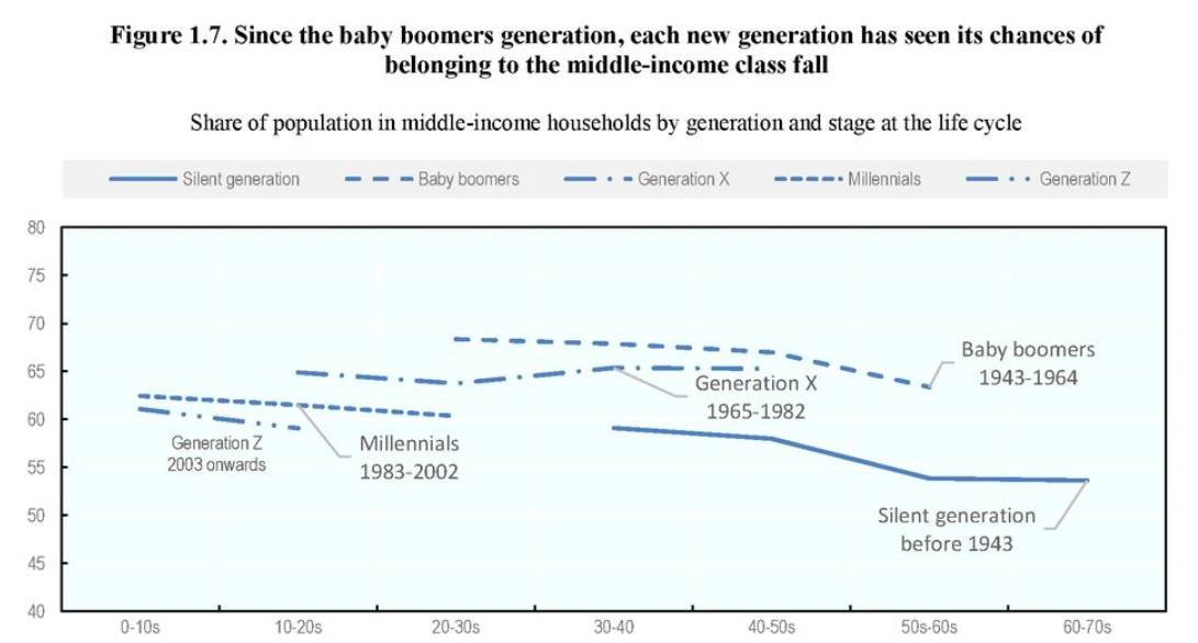 La OCDE acaba de publicar un informe desolador. Se titula Bajo presión: la clase media, exprimida. La conclusión es clara: mientras el 70% de la generación del baby boom ya era parte de la clase media en su segunda década de vida, los millenials tan sólo lo son en un 60%. El retroceso es más que evidente.