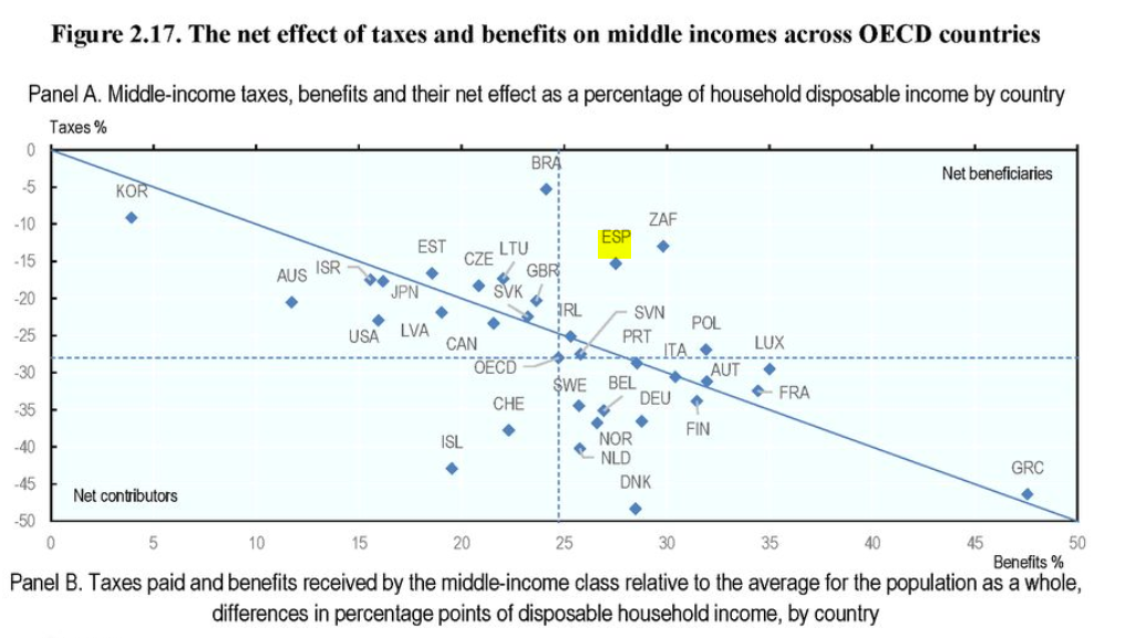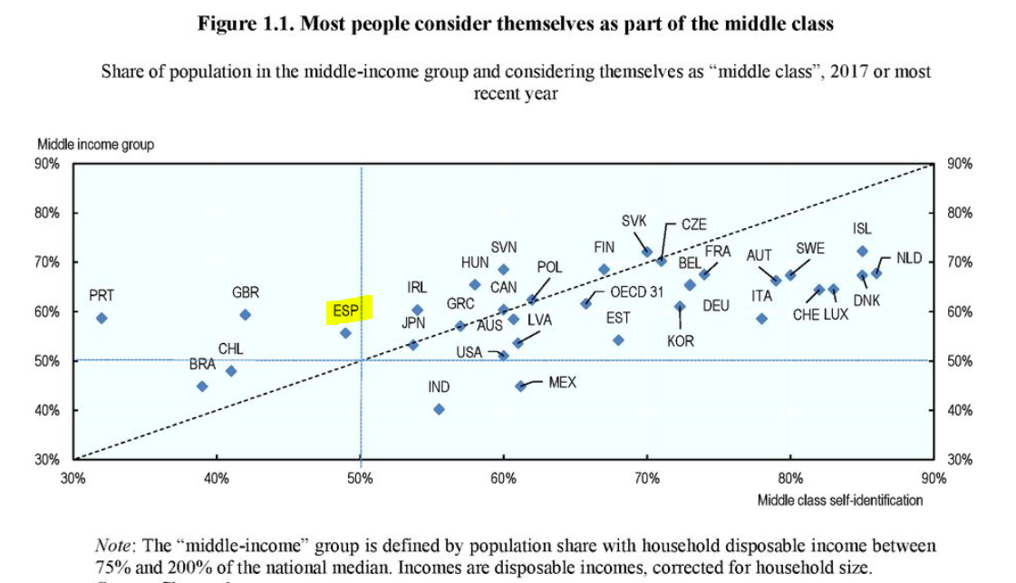 Dicho de otro modo, la brecha intergeneracional se agranda. Este es un fenómeno del que ya hemos hablado en esta columna, y la OCDE apunta en la misma dirección. Los jóvenes no sólo soportan unos niveles de renta menores, sino que tienen que afrontar las consecuencias de los desmanes políticos anteriores. Esto es: mayor precio de la vivienda, mayores cargas tributarias (especialmente indirectas) y un largo etcétera. España, desafortunadamente, no sale bien parada en la foto de la OCDE. En 2017, había menos del 50% de la población formando parte de la clase media.
