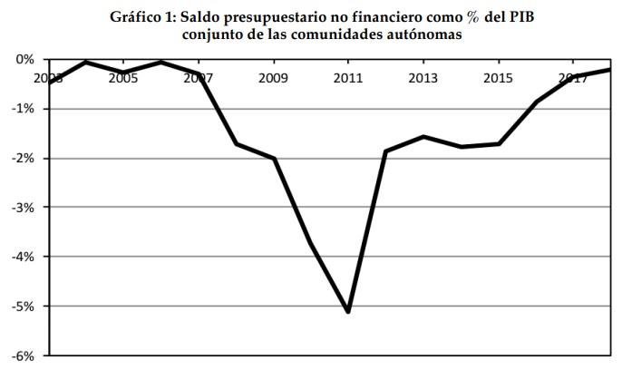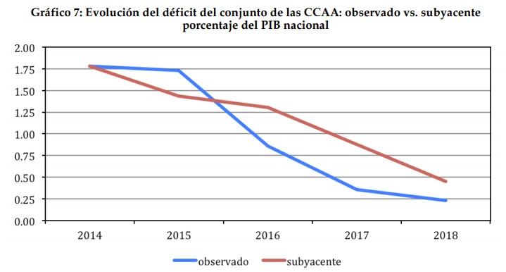 Tanto es así que si se corrigen los dos primeros factores atípicos, normalizando tanto los ingresos procedentes del sistema de financiación como el pago de intereses –tras eliminar las subvenciones del Estado–, el "déficit subyacente" (real) de las comunidades autónomas ascendería al 0,45% en 2018, hasta rozar los 5.500 millones de euros, casi el doble que la cifra oficial y por encima del objetivo del 0,4% del PIB.