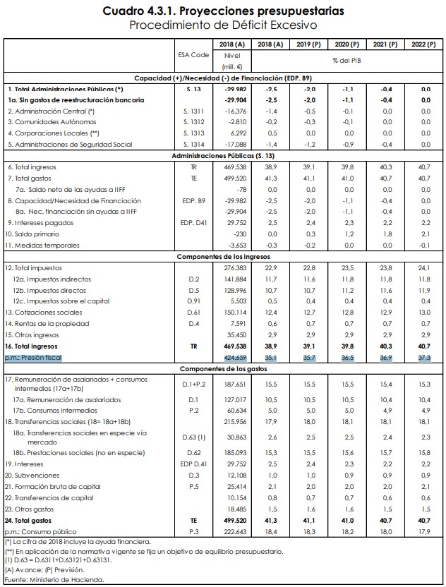 El Ejecutivo del PSOE prevé ahora una mayor desaceleración del PIB y, aunque mantiene un avance del 2,2% para este año, lo ha rebajado tres décimas para 2020 y 2021, hasta el 1,9% y el 1,8%, respectivamente. Asimismo, pretende reducir el déficit del 2,5% del PIB en 2018 al 2% este ejercicio -frente al 1,3% pactado con la UE-, al 1,1% en 2020 y al 0,4% en 2021 para, finalmente, alcanzar el equilibrio presupuestario en 2022, al término de la presente legislatura.