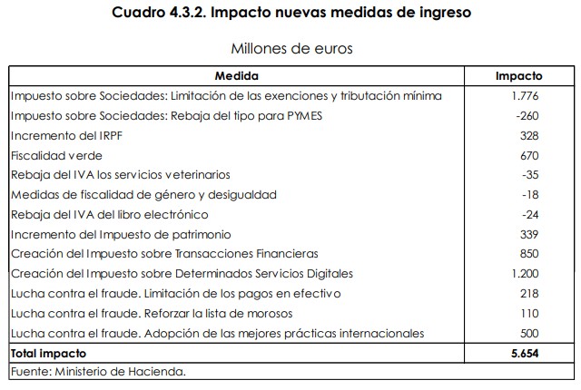La intención del Gobierno es mantener prorrogados los Presupuestos de 2018 durante el presente año y, posteriormente, presentar unas nuevas cuentas de cara a 2020, donde, entre otras medidas, se incluirán las subidas fiscales acordadas con Podemos en la fallida presentación de los Presupuestos de 2019, cuyo impacto recaudatorio se estima en 5.654 millones de euros, tal y como recoge el siguiente cuadro.