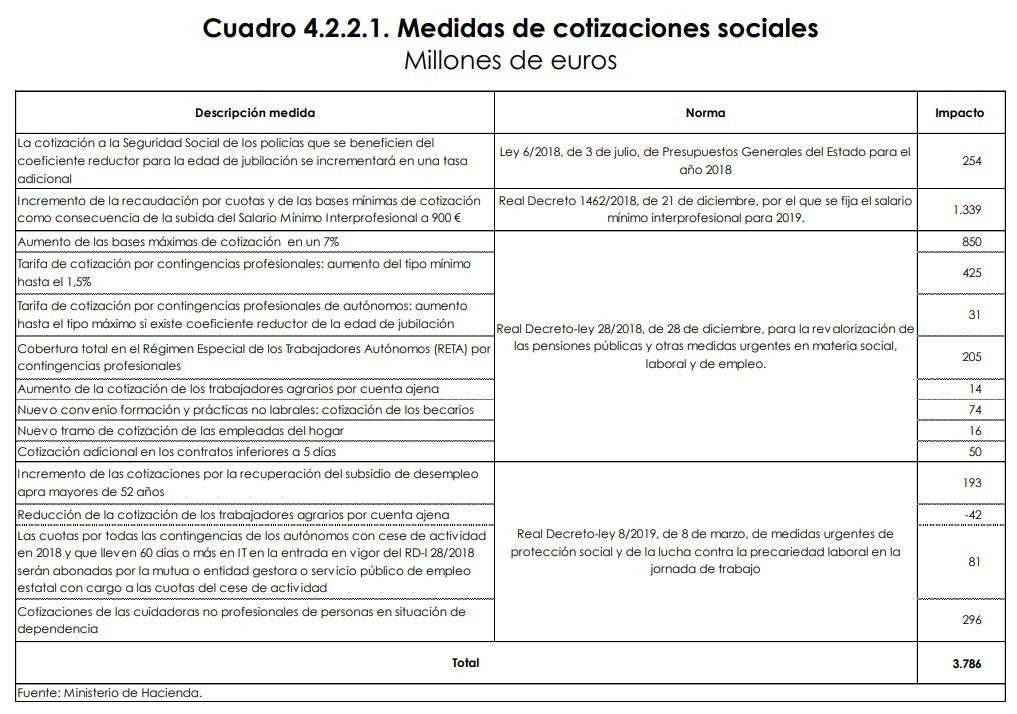 Por último, a este paquete fiscal que entrará en vigor a partir de 2020, se suma el aumento de las cotizaciones sociales registrado el presente año tras la subida del salario mínimo a 900 euros al mes, por el incremento de la base mínima de cotización, con un impacto estimado en 1.339 millones de euros, entre otras medidas que recoge el siguiente cuadro, y cuyo impacto recaudatorio asciende a 3.786 millones de euros. Asimismo, la reducción de las deducciones fiscales aplicadas a la contratación indefinida podrían sumar otros 500 millones anuales a partir de 2020, según los cálculos del Ejecutivo.