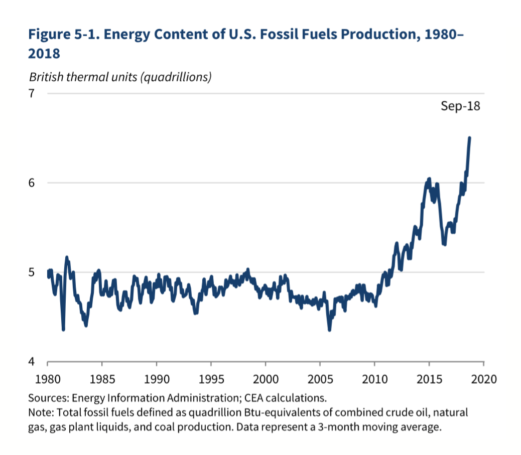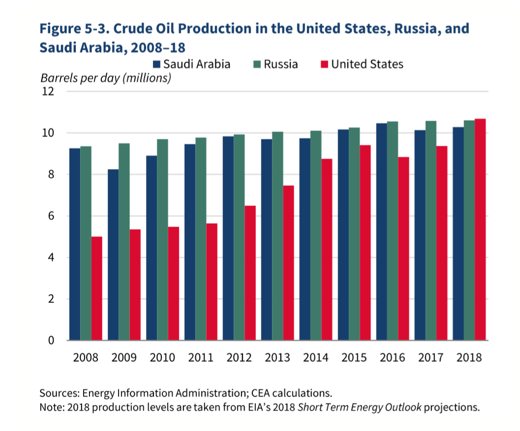 En noviembre de 2017, la producción de crudo rebasó el récord histórico, que databa de 1970 y consistía en rebasar la barrera de los 10,1 millones de barriles diarios. En 2018, esta ratio ha seguido aumentando, hasta llegar a los 10,7 millones de barriles por día. En los últimos ocho años, el aumento ha sido notable, puesto que los niveles de producción previos al boom de la fractura hidráulica eran inferiores a los actuales en 6 millones de barriles por día. La producción se concentra, principalmente, en Texas, Dakota del Norte, Montana y Nuevo México.