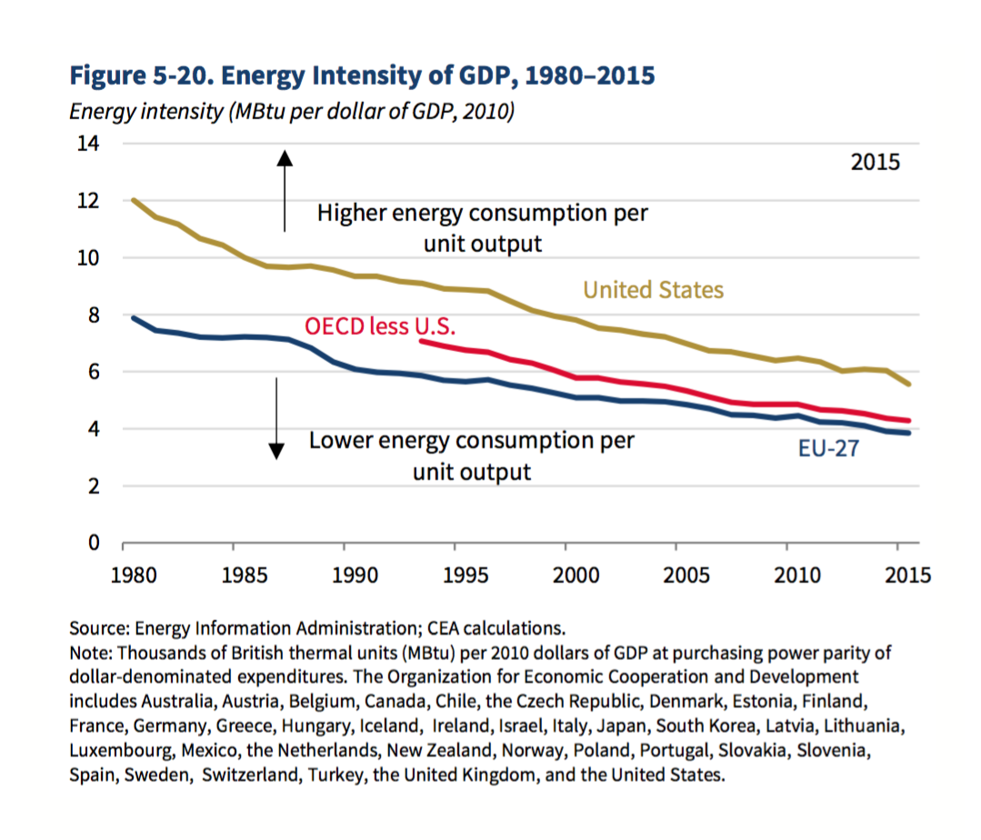 ¿Y qué hay de la sostenibilidad medioambiental? Como vemos en el siguiente gráfico, la intensidad energética del PIB norteamericano es hoy dos veces menor que en los años 80: