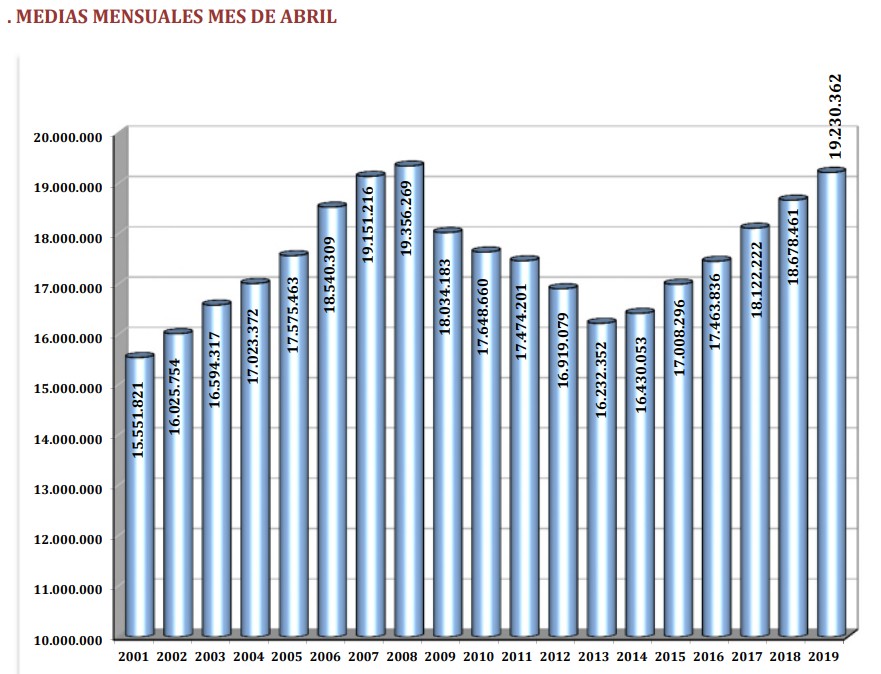 El mercado laboral mantiene el buen tono en el mes de abril, y no sólo por el impulso de la Semana Santa, ya que, una vez eliminado el efecto estacional, el empleo también crece, mientras que el paro cae. En concreto, la Seguridad Social sumó una media de 186.785 afiliados el pasado mes, su segundo mejor abril de la serie histórica tras el de 2017, cuando ganó algo más de 212.000 cotizantes, según informó el Ministerio de Trabajo este lunes. De este modo, el volumen total de ocupados se situó en 19.230.362, la cifra más alta desde julio de 2008.