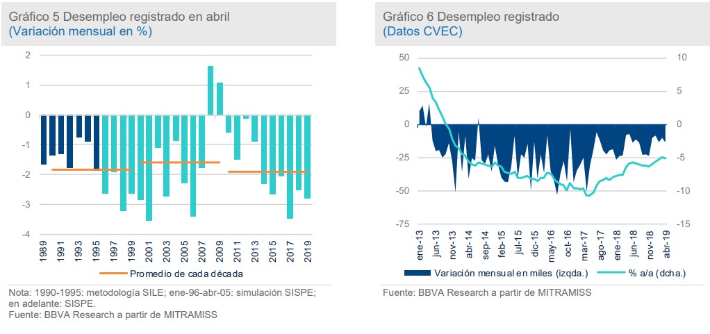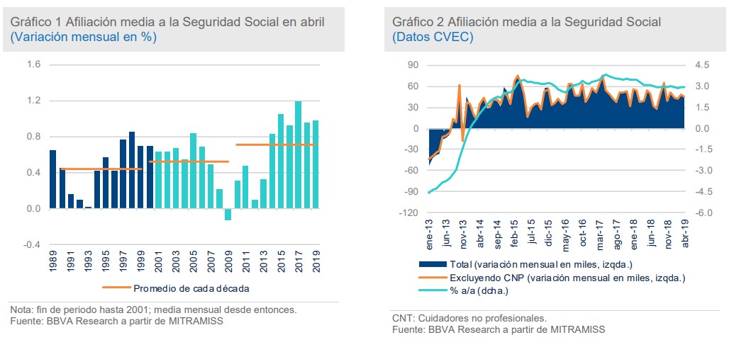 En el último año, la Seguridad Social ha registrado 551.901 nuevos cotizantes, a un ritmo del 2,9% interanual, muy similar al de abril de 2018 (3,07%). Este mes suele ser positivo en materia laboral por el impulso de la Semana Santa, de ahí la importancia de descontar el efecto estacional para poder analizar la evolución del empleo de forma homogénea a lo largo del año. Así, una vez eliminado el efecto estacional y de calendario, el número de afiliados se habría incrementado en torno a 47.000 personas, igual que en marzo, según las estimaciones de BBVA Research.