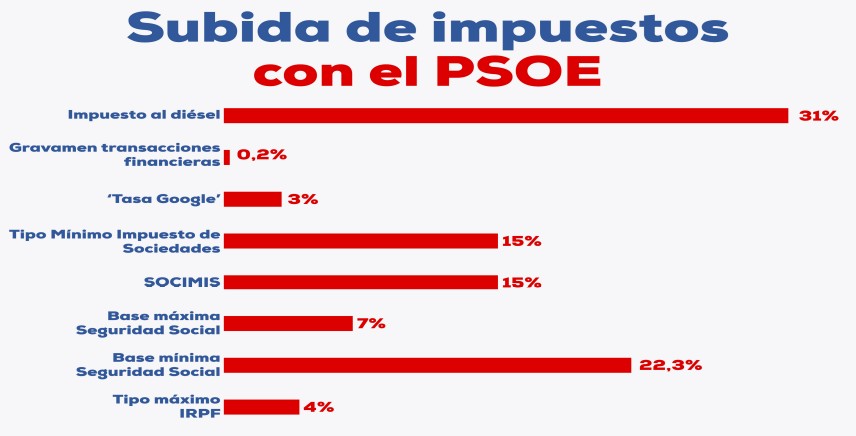 Sin embargo, dicho plan enviado la tarde del martes -el Gobierno esperó el tiempo suficiente para enviarlo al límite del plazo, pero una vez pasadas las elecciones- esconde grandes subidas de impuestos, que ya conocíamos, pues son las planteadas en el fallido proyecto de Presupuestos Generales del Estado (PGE) devueltos al Gobierno, así como las ya aplicadas con el incremento de bases máximas y mínimas de la Seguridad Social, las cuales, estas últimas, ya están operativas en 2019. Esos incrementos de impuestos van desde la subida del IRPF en 4 puntos, al incremento de un 31% del impuesto sobre el diésel, hasta la subida al 15% mínimo del tipo medio efectivo en el impuesto de Sociedades.