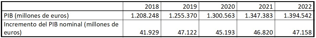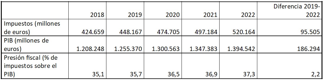 No son 26.000 millones, como se ha comentado últimamente. No lo son porque esa comparación es calculando la diferencia entre la presión fiscal de 2018 (35,1% del PIB) y la de 2022 (37,3% del PIB) pero ambos porcentajes sobre el PIB de 2018, cuando cada uno de ellos tiene que ser sobre el PIB de su año. Esos 2,2 puntos de incremento de presión fiscal sobre el PIB son 26.500 millones de euros calculados ambos porcentajes sobre el PIB de 2018, de 1,208 billones de euros.