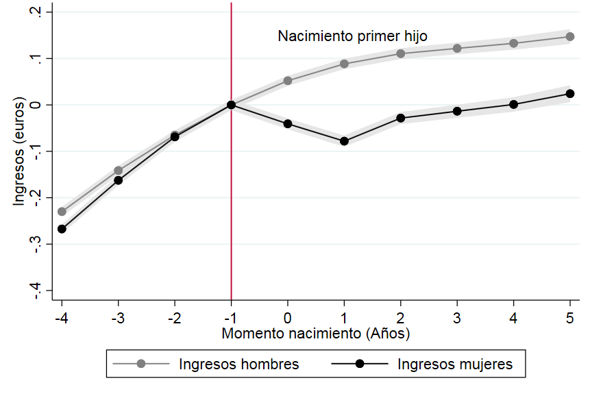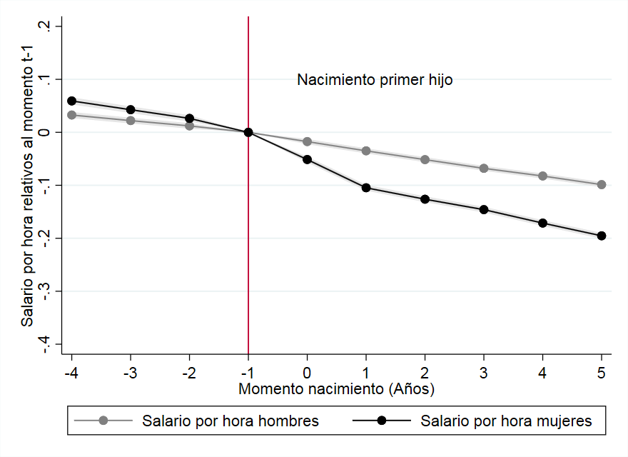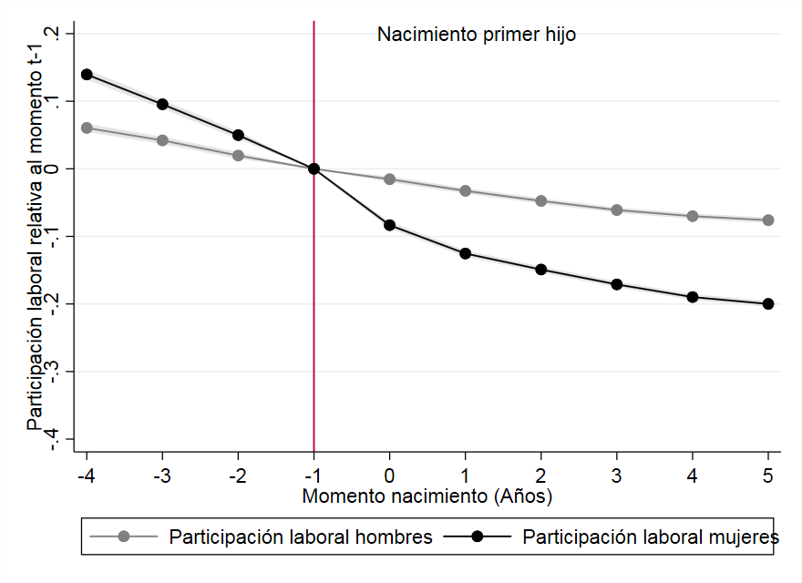 - Dicha caída se debe a que un número significativo de madres decide priorizar el cuidado de sus hijos a su carrera profesional, ya sea dejando de trabajar temporalmente o trabajando menos horas. Así, una vez corregido el efecto edad y año -que elimina la tendencia positiva de la gráfica-, se observa que la participación laboral de las mujeres se reduce tras el primer hijo en comparación con los hombres debido al abandono temporal del trabajo.